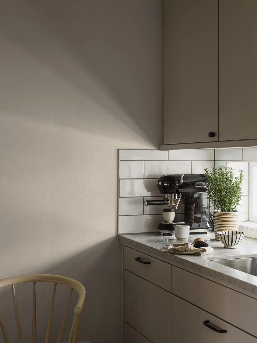 Här ser den enfärgade tapeten Vega i en neutral beige nyans. Den väl avvägda beige kulören och det diskreta vävmönstret ger väggen vackert djup och rummet en klädd, ombonad känsla.