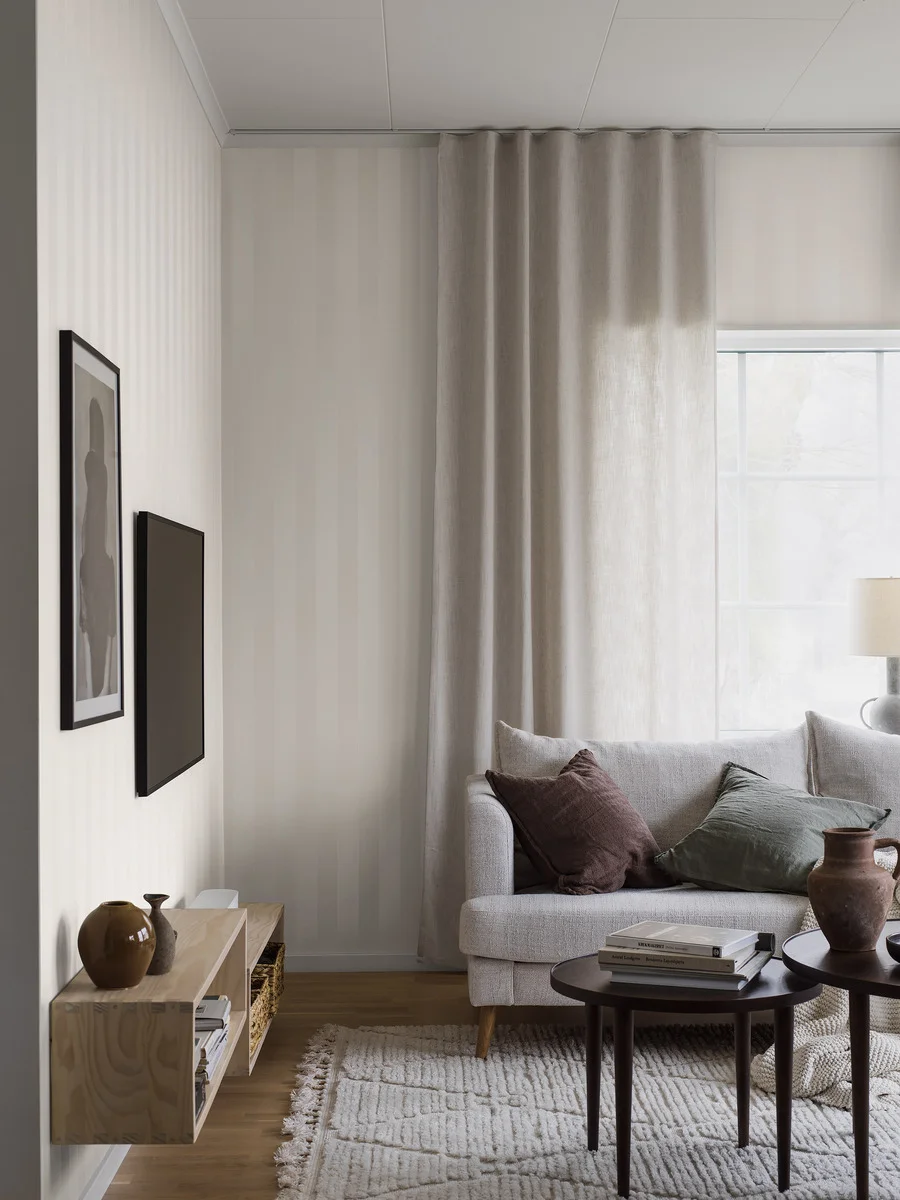 En klassisk, bredrandig tapet som Karl går aldrig ur tiden. Och Karl har en extra finess: breda blockränder ton i ton, varannan matt, varannan skimrande vilket ger en spännande visuell effekt, särskilt när ljuset faller på väggen. De svala vita nyanserna ger rummet en härlig rymd och en lugn, luftig atmosfär.
